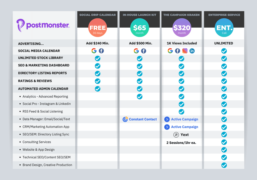 Optimized in the franchise and e-commerce industries, Post Monster℠ makes professional marketing tools accessible to all businesses, big and small. You can choose your degree of savings by choosing your degree of consulting vs. self-serve platform use.